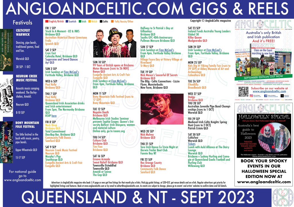 This is the Queensland and Northern Territory gig guide for September 2023, as featured in Anglo&Celtic magazine September edition. If you just want to download the gig guide on its own without downloading the whole magazine, you can do so at this link. The magazine is free to read and download.