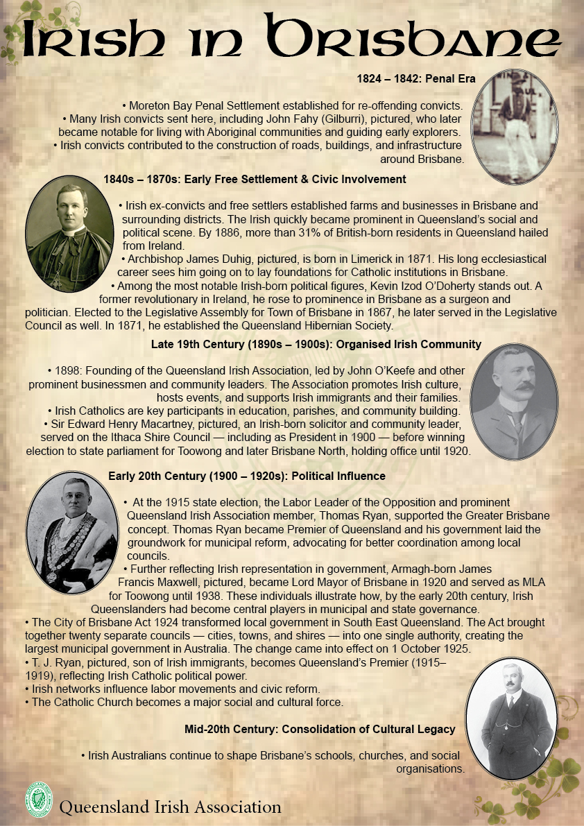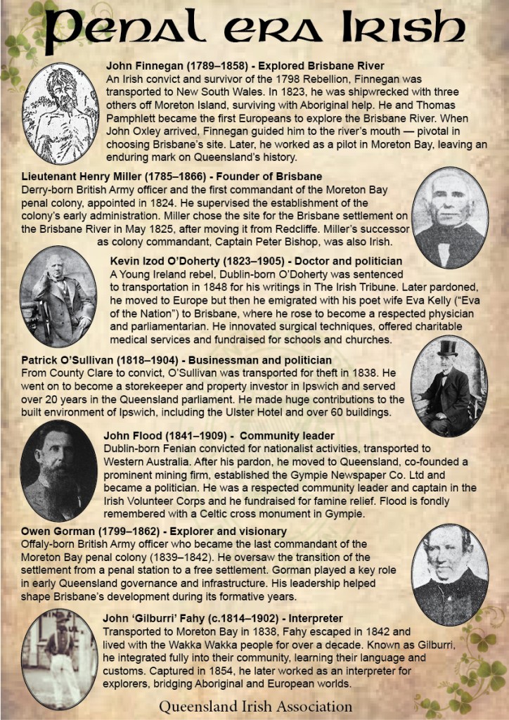 One poster lists noted Irish convicts and commandants at Moreton Bay Penal Colony. From escaped convict John Finegan, who guided John Oxley to the Brisbane River, to Derry-born Lieutenant Henry Miller who was the first commandant at the colony, and indeed to the last commandant Owen Gorman from County Offaly, the Irish were integral to the founding of Brisbane. Others featured are former convicts who went on to become community leaders and politicians. Covering Irish convict history was requested by the organisers.