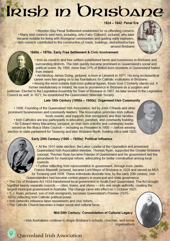 The posters, created by QIA Director and Public Relations Officer Mary Allen, tell the story of the Irish in Brisbane from convict times through to the present day.