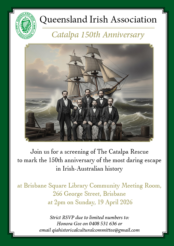 Join Queensland Irish Association for a screening of The Catalpa Rescue documentary at Brisbane Square Library Community Meeting Room, 266 George Street, Brisbane, at 2pm on Sunday, 19 April 2026. Strict RSVP due to limited numbers to: Honora Gee on 0408 531 636 or email qiahistoricalculturalcommittee@gmail.com