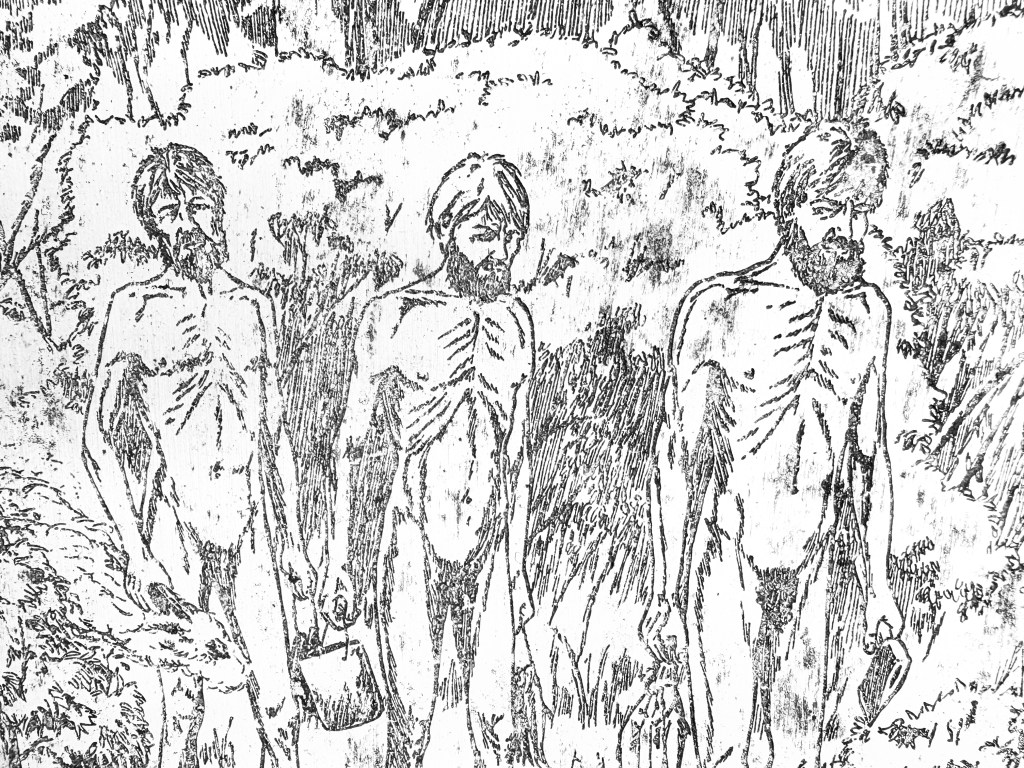 Picture depicts ‘The Finding of Pamphlet’. It shows Finnegan and his fellow convicts being rescued by John Oxley.
